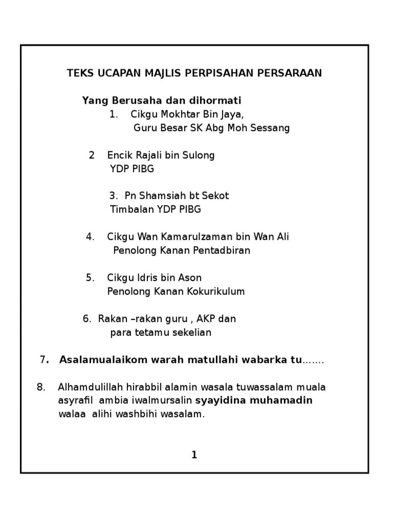 Teks pembawa acara pengajian yang sering ada di acara pengajian yang di lakukan oleh umat islam indonesia pengajian ini biasanya dilakukan di setiap tips menjadi pembawa acara yang baik dan benar. Assalammualaikum w.h.t dan salam sejahtera… yang saya hormati tuan pengarah timbalan pengarah, yang dipertua majlis perwakilan pelajar, pensyarah pensyarah kanan pensyarah akademik staf sokongan dan para pelajar yang saya kasihi sekelian. Contoh teks ucapan perpisahan guru. Berikut ini contoh teks persuasi bertema pendidikan dan lingkungan. Teks ucapan majlis perpisahan persaraan. Contoh teks pembawa acara pengjian umum. Assalammualaikum w.h.t dan salam sejahtera… yang saya hormati tuan pengarah timbalan pengarah, yang dipertua majlis perwakilan pelajar, pensyarah pensyarah kanan pensyarah akademik staf sokongan dan para pelajar yang saya kasihi sekelian. Penjelasan lengkap seputar contoh teks tanggapan kritis. Kata kata untuk majlis persaraan kadang motivasi media sosial facebook. Contoh soal materi teks cerita inspiratif (kelas ix). Pemilihan tema dalam contoh ini, kami sesuaikan dengan tema. Keselarasan antara pendidikan di sekolah dan di rumah. Teks ucapan majlis perpisahan persaraan.